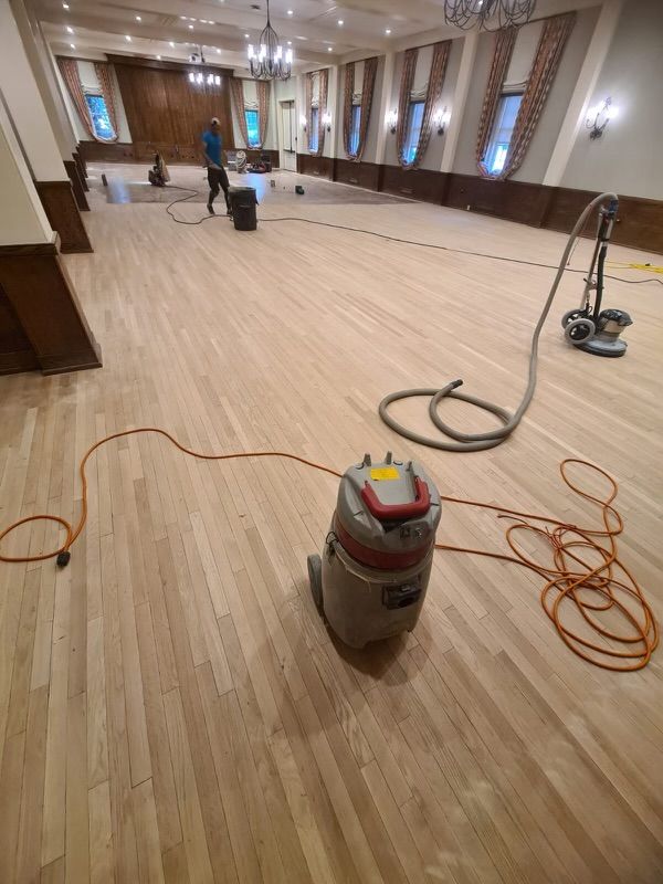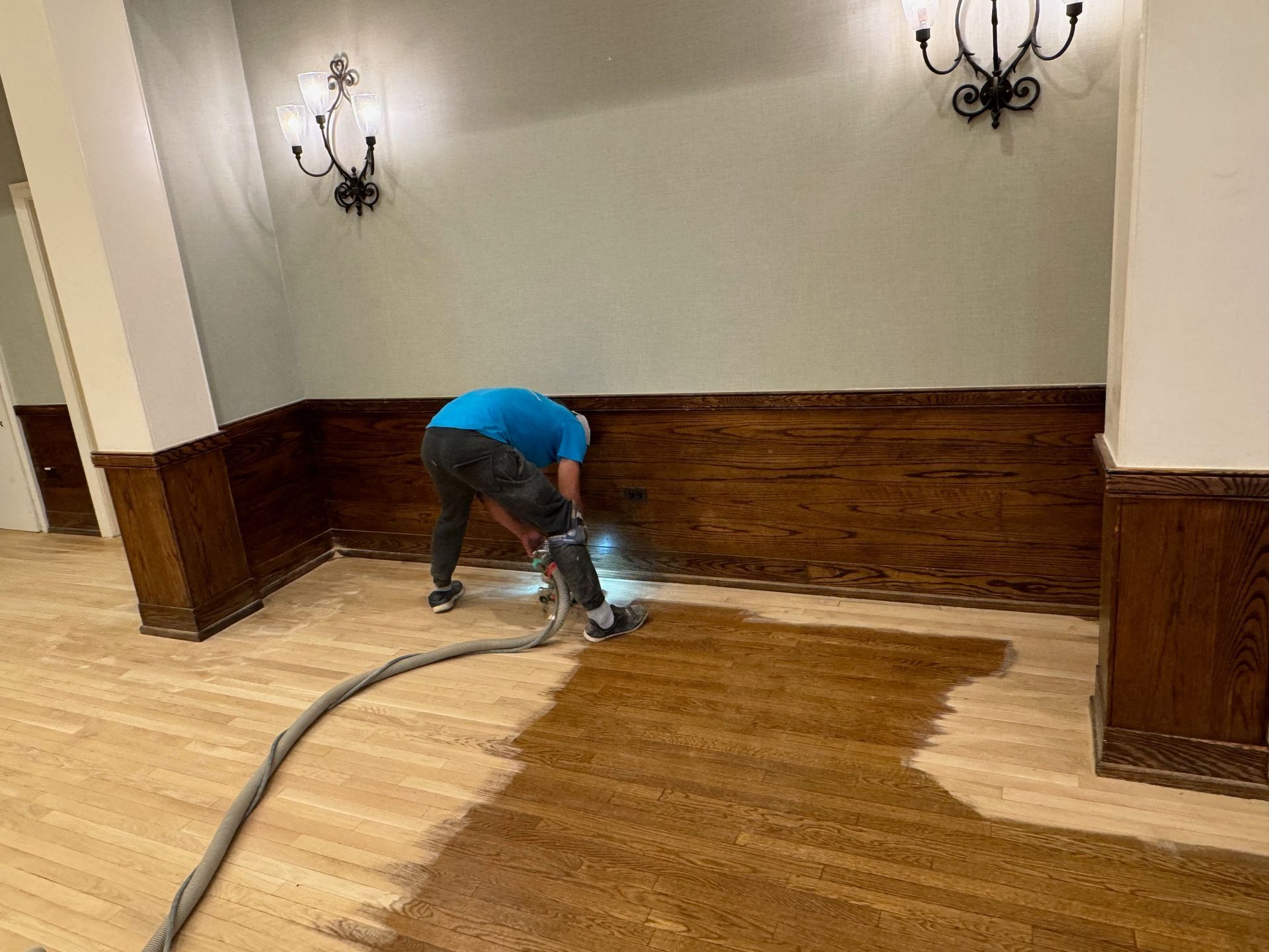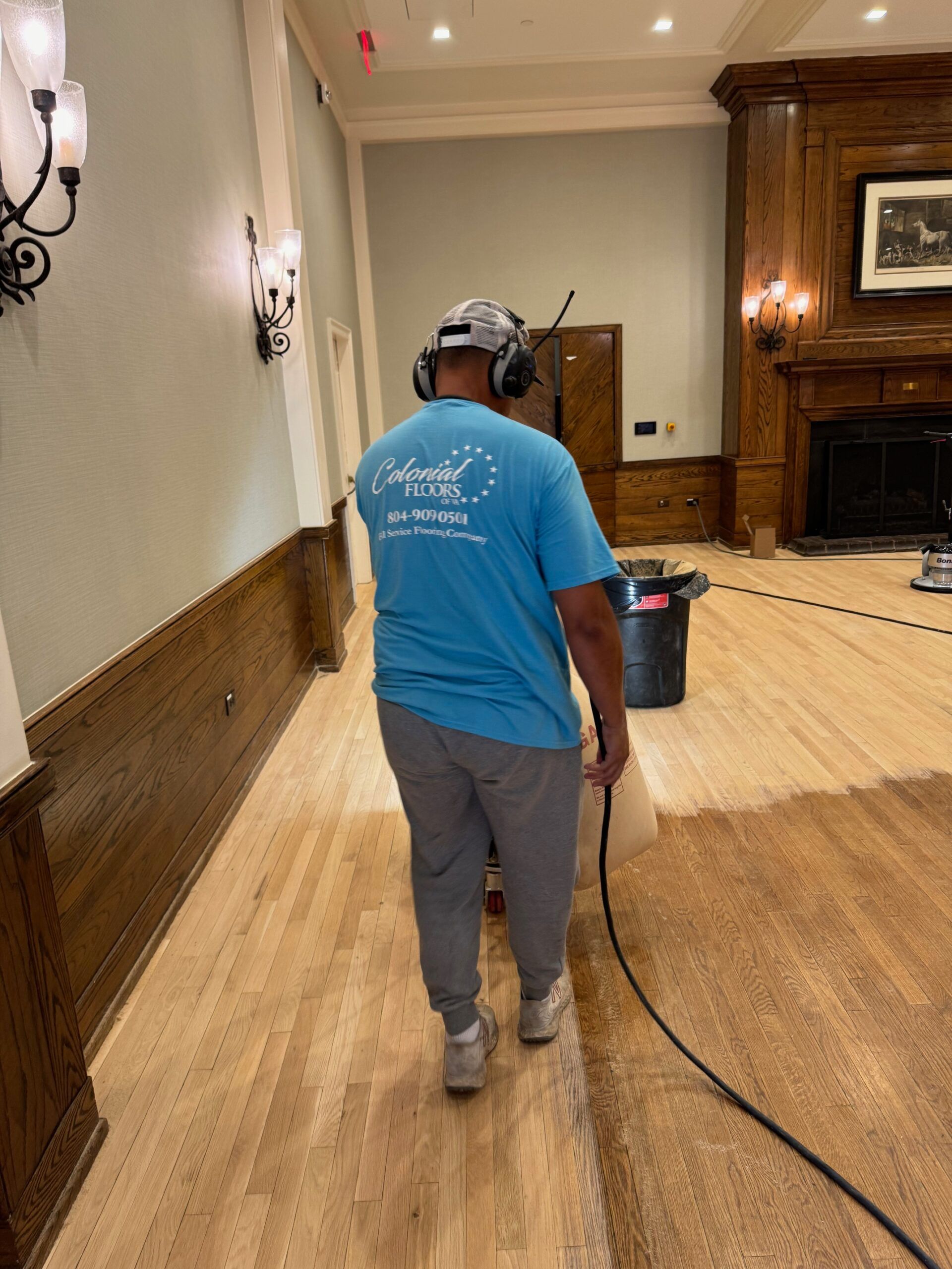 Get a sneak peek at our current project—a stunning ballroom renovation! At Colonial Floors of VA, we’re hard at work sanding and refinishing the floors to bring out their natural elegance and shine. Although we don’t have the finished pictures yet, you can already see the transformation taking shape. Stay tuned for the grand reveal of this beautiful space!